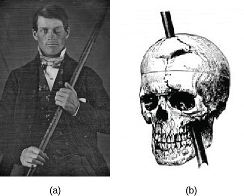 (a)フィニアスゲージは、1848年の鉄道建設事故で鉄パイプが頭蓋骨を貫通した。(b)ゲージの前頭前野は左半球でひどく損傷。鉄パイプは左側からゲージの顔に入り、目の後ろを通り、頭蓋骨の上部から出て、約80フィート離れたところで止まった。