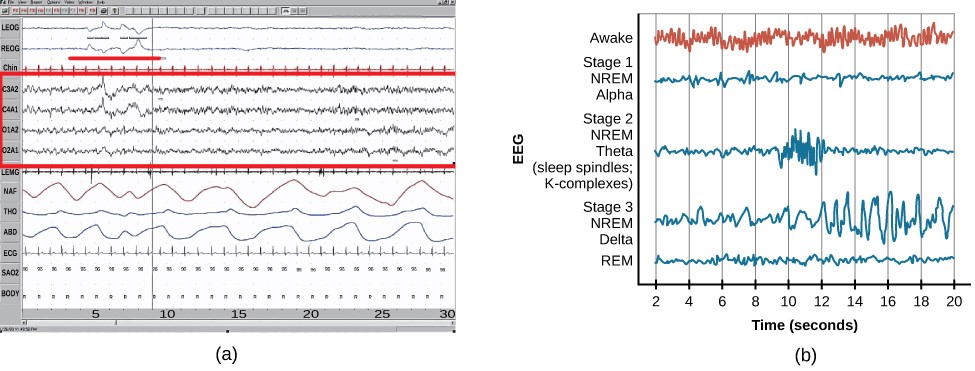 (a)急速な眼球運動の期間(短い赤い線) (a)の赤いボックスで概説されているレム睡眠に関連する脳波は、覚醒時に見られるもの(b)と非常によく似ている。