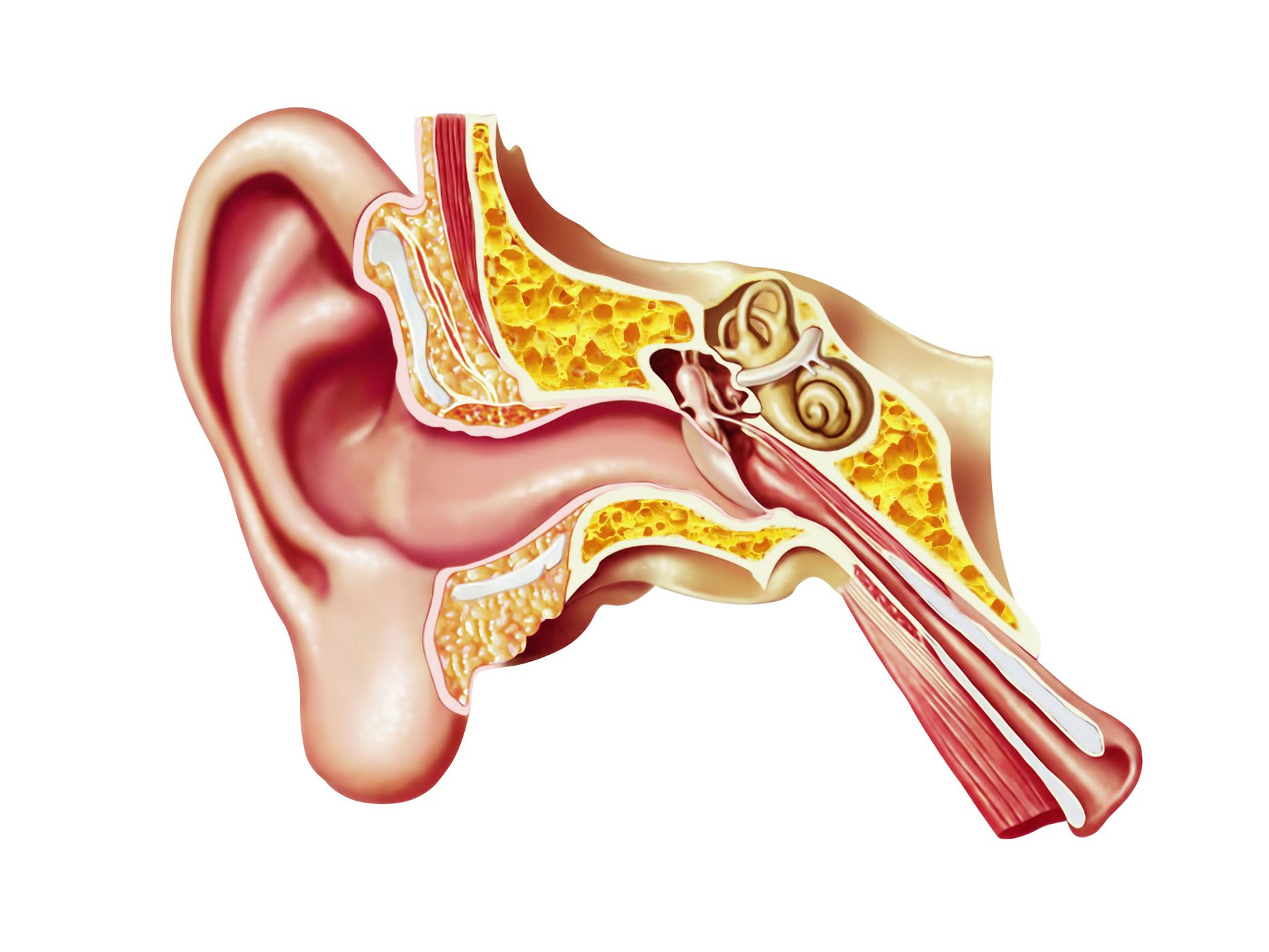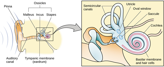 音波は耳道に沿って伝わり、鼓膜に当たり、鼓膜を振動させる。この振動により3つの耳小骨が動き、あぶみ骨は卵円窓oval windowとして知られる蝸牛の薄い膜に押し込まれる。