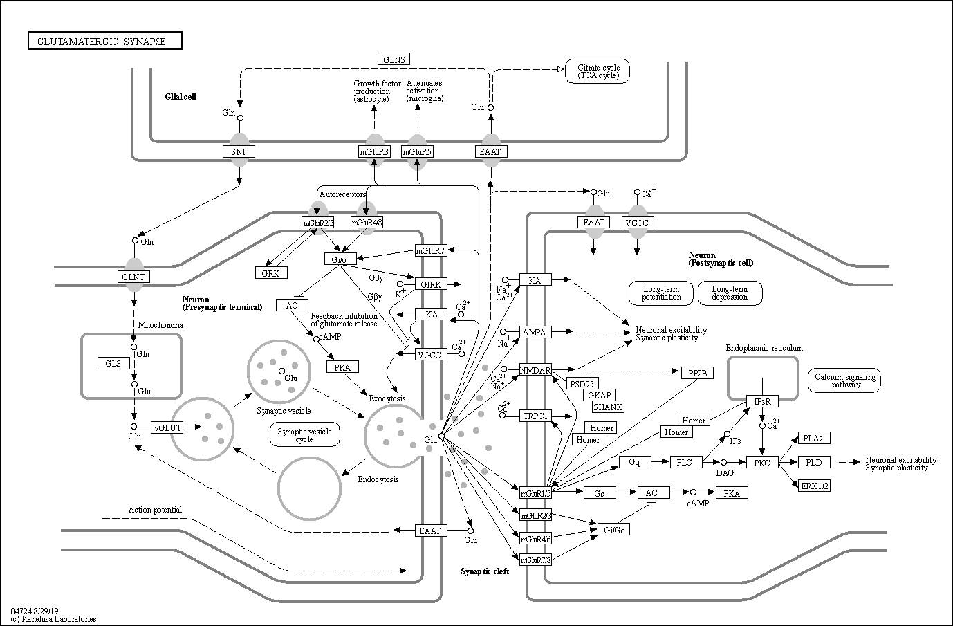 I chose the Glutamatergic synapse from KEGG PATHWAY Database. Glutamate is the major excitatory neurotransmitter in the mammalian central nervous system, and it is packaged into synaptic vesicles in the presynaptic terminal. It acts on postsynaptic ionotropic glutamate receptors to mediate fast excitatory synaptic transmission when released into the synaptic cleft (KEGG PATHWAY., n.d.).